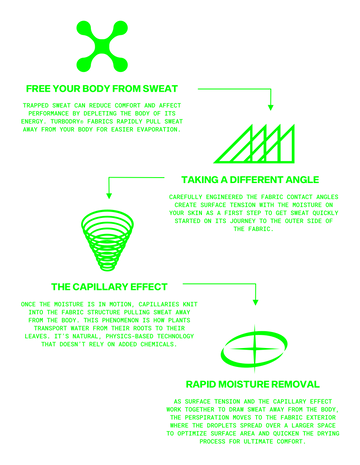 TurboDry® is one of the fastest drying fabric technologies that exists. This revolutionary fabric features a patent-pending technology that naturally transports moisture away from your skin. This is the TurboDry® difference.